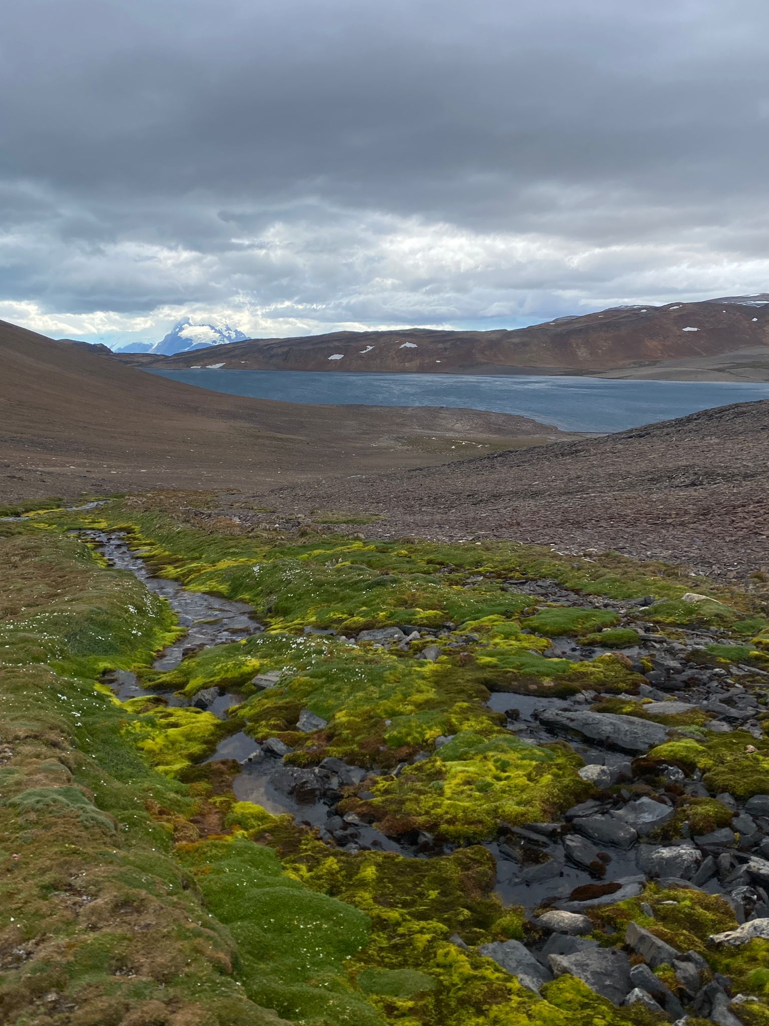 Für 5km folgen wir den Ufern eines ausgedehnten Sees, darüber einige felsige Gletscherberge, zum Großteil aber abgerundete Kuppen aus schwarzem Geröll. Wir kommen uns vor wie im tibetischen Hochland. Für eine Weile sind es nur das Rauschen des Windes und der stete Wellengang, die uns auf unserem einsamen Weg begleiten. Gelegentlich entspringt eine Quelle in der ansonsten kargen, nur an Fossilien reichen Oberfläche, dann schimmern dichte Teppiche aus Moosen auf den dunklen Felsen überall dort, wo ein Wasserlauf rinnt. Ein betörender, Anis ähnelnder Duft geht von diesen aus, der so gar nicht in diese Einöde zu passen scheint. Es ist bereits kurz vor 20 Uhr, als wir den See und die Hochebene endlich hinter uns lassen.