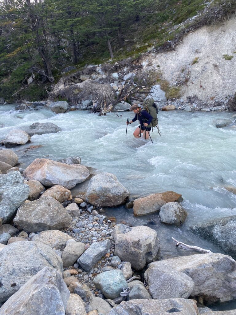 Vor uns erstreckt sich das weite Tal eines Gletschers, Kilometer breit und teils mit Eis gefüllt, dahinter die Berge an der Grenze zu Chile. Nach einer weiteren Stunde des Abstiegs, heute ist es Romain, dem die Kraft ausgeht, schlagen wir an einem größeren Fluss unser Lager auf. Mit diesem tut sich direkt das nächste Hindernis auf, denn morgen geht unsere Tour auf seiner anderen Seite weiter. Entweder wir können ihn furten oder wir müssen erneut 500 Höhenmeter aufsteigen in eben jene Bergregion, aus der wir heute gekommen sind. Diese Perspektive lässt mich unruhig schlafen, auch die knappe Ration von 250g Pasta trägt wenig zur Sättigung bei. Die größte Enttäuschung aber eröffnet sich, als ich das vermeintliche Öl darüber gieße. Essig statt Öl habe ich teuerst erworben und ein halbes Kilogramm dessen unnötig tagelang mit mir herumgeschleppt. Hier oben ohne Gemüse ist dieser vollkommen nutzlos, jedenfalls ist er in den Nudeln keine Bereicherung, so viel kann ich garantieren.Fünf mal überquere ich den Fluss, einmal zum Testen, ob ich der Strömung standhalten kann, zwei weitere Male mit dem Gepäck. Er ist zwar 12m breit, geht uns an dieser Stelle aber nur bis ans Knie und ist harmlos zu überwinden. Im Zickzackkurs die Bergflanke querend, häufig gezwungen weite Umwege aufgrund von Dickichten, Felsstufen oder Schluchten einzuschlagen, nähern wir uns langsam dem Tal des Rio Norte an. In dieser Gegend weiden Kühe, die Flora der ansonsten dichten Moose und Flechten, dem federnden Untergrund und den Feuchtwiesen ist völlig zerstört. Dazu kommt die außerordentliche Trockenheit, in Folge derer die meisten der kleineren Seen und Tümpel kaum Wasser führen. Nach zwei Stunden erreichen wir eine Anhöhe aus gletschergeschliffenen Felsplatten. Einige gigantische Felsblöcke liegen wie von magischer Kraft dort verstreut. Noch zeigen sich die Gletscher, die sie hierhergetragen haben am Horizont, dazwischen zahlreiche Seen und Felslandschaften. Wäre es etwas wärmer, böten die in kleinen Wasserfällen und Gumpen herabströmenden Bächlein eingefasst von Moosen und mannshohen Südbuchen ein liebliches Bild, mit dem uns entgegenpeitschenden Wind und den dunklen Wolken aber kommt uns dieser Landstrich rau und unwirtlich vor. Später am Mittag zeigt sich die Sonne. Wir treffen auf einen Viehtreiberpfad und sind fortan etwas beunruhigt, wir könnten auf diesem Rangern begegnen, die uns sicherlich augenblicklich aus diese grandiosen Umgebung verbannen würden. Nicht selten bin ich erstaunt, wie zuverlässig meine per Satellitenbild erstellte Route durch das komplexe Terrain aus Felsstufen und Wald hindurchleitet und den leichtesten Weg findet. Mit der Ankunft im Tal des Rio Norte wandelt sich unsere Umgebung. Das tief eingeschnittene Tal ist eingefasst von hohen Felswänden, die den Wind abschirmen. Große Südbuchen gedeihen an seinem Grund an den Ufern eines mächtigen, mal sich gemächlich talabwärts schlängelnden, mal in Stromschnellen herabtosenden Gletscherflusses. Darüber befindet sich eine der höchsten Felswände Patagoniens, besetzt mit einigen Hängegletschern, die fast bis zu uns hinabreichen. Auch wenn ein dünner sich gelegentlich verlierender Pfad vorhanden ist, kommen wir bald nur noch langsam voran. Für den Folgetag kündigt sich schlechtes Wetter an, sodass wir es heute noch möglichst weit schaffen wollen, doch 18km wegloses Gelände im Wald und die Wälder hier sind keinesfalls mit unseren aufgeräumten europäischen zu vergleichen, lassen uns wieder volle 10 Stunden unterwegs sein, sodass wir überaus erschöpft am vorhergesehenen Lagerplatz oberhalb einer Moräne und des Sees, in den ein 2000 m hoher Gletscher am Gipfel des Cerro Norte entspringend mündet, ankommen. So beeindruckend der Eisfall ist, uns ist die Größe der Pasta Ration im Moment wichtiger