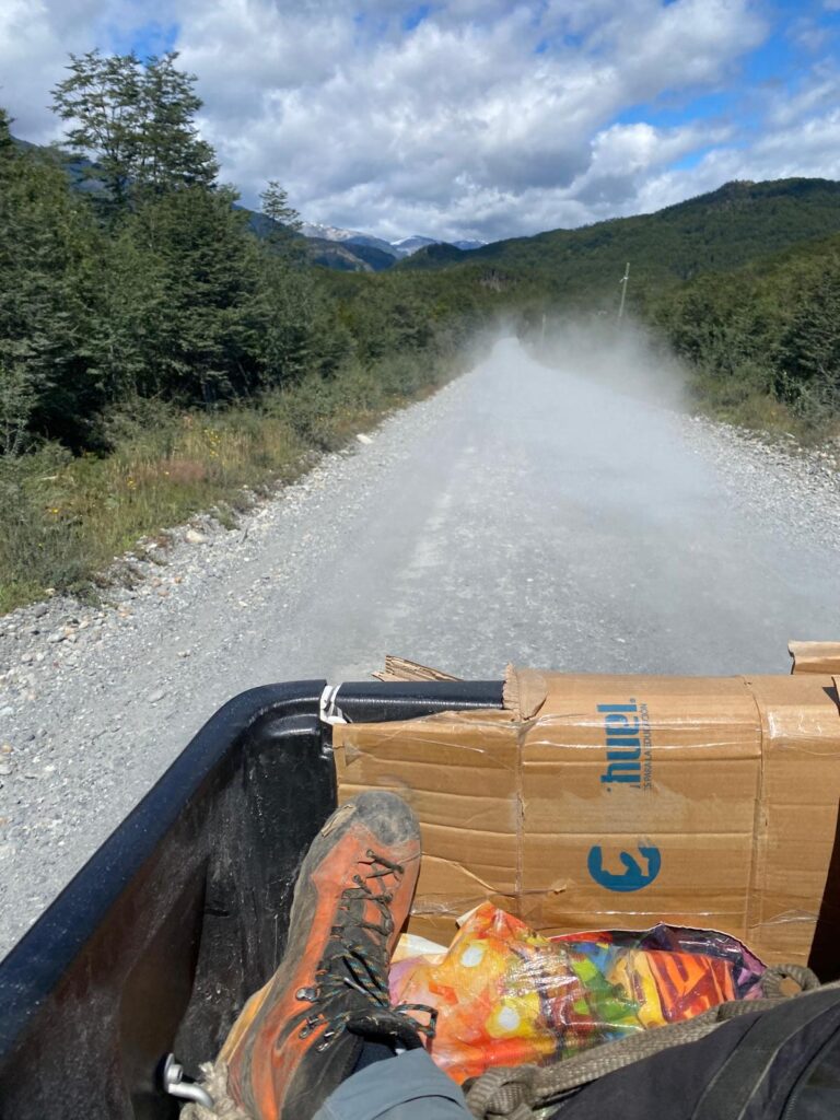 Die Nacht über regnet es viel und mein Schlafsack ist am Morgen so nass, dass ich mich frage, ob er je wieder werden wird wie zuvor, wenn man bedenkt, wie empfindlich Daune ist. Als erste stehen wir um Punkt 8 Uhr an der Türschwelle des Grenzpostens und haben Augenblicke später die notwendigen Stempel im Pass und dürfen weiter. Allmählich endet der Regen und die Wolken lichten sich. Über schlammigen Grund stapfen wir durch den Südbuchenwald aufwärts in Richtung Chile. Ohne Rucksack wäre dies ein spannender botanischer Spaziergang, doch so sind wir froh, über jede Handvoll geschaffter Kilometer auch wenn das Terrain flach und leicht passierbar ist, von einigen umgestürzten Bäumen abgesehen. Auf chilenischer Seite empfängt uns eine Straße, Verkehr ist dort jedoch keiner, weil diese nur über eine Fährstrecke erreichbar ist. Ein gigantischer Flugplatz wirkt noch deplatzierter als die breite Schotterpiste, der wir durch meist abgeholzte oder abgebrannte Wälder folgen. Um 13 Uhr, zum ersten Mal waren wir auch was die Kilometerleistung betrifft halbwegs flott, erreichen wir den Grenzposten Chiles. Dieser Grenzübertritt dauert deutlich länger, letztlich lässt man uns aber ziehen, glücklicherweise, ohne unsere Rucksäcke nach frischen Lebensmitteln zu durchsuchen, sonst wären wir des Zwiebelschmuggels verurteilt worden. Unsere zwei Zwiebeln sind uns dann Mittagsmahl an der Bootsanlegestelle. Beim Öffnen des Rucksacks erleide ich den bisher größten Schock dieser Reise und so manch anderer auch.