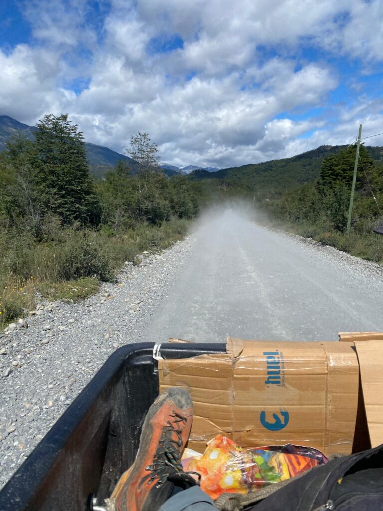 Bis zu einem ersten See kurz hinter dem Ort werden wir zwar schnell mitgenommen, dort warten wir aber 3 Stunden und zehn Autos fahren vorbei, ohne anzuhalten. Am frühen Abend haben wir dann schließlich Glück. Ein gigantischer Pickup hält, und die beiden Chilenen nehmen uns noch bis hinter die Fährverbindung mit.