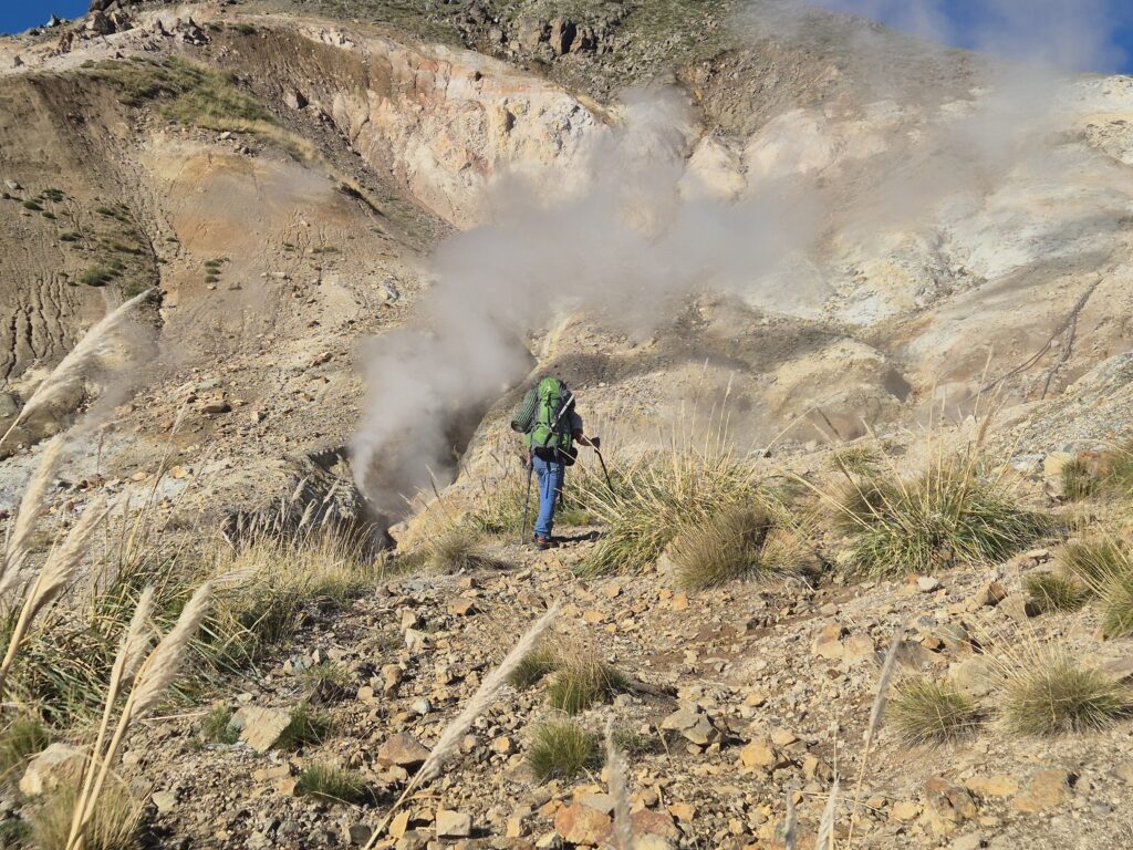 Nachdem die letzten Quellen unerreichbar für mich waren, wir aber leidenschaftliche Heißbader in wilder Natur sind, haben wir uns ein neues Ziel der Begierde ausgesucht. Termas de Chilluhan. Nur 700 Höhenmeter und nur 3,68 Kilometer. Das ist doch nichts, denken wir. Schaffen wir noch locker am späten Nachmittag – denken wir.Dann ist es doch 17:30 h, als wir mit unserem Trekkinggepäck losmarschieren. Nach 40 min zügigem Marschierens erreichen wir einen Pass und glauben uns fast am Ziel.