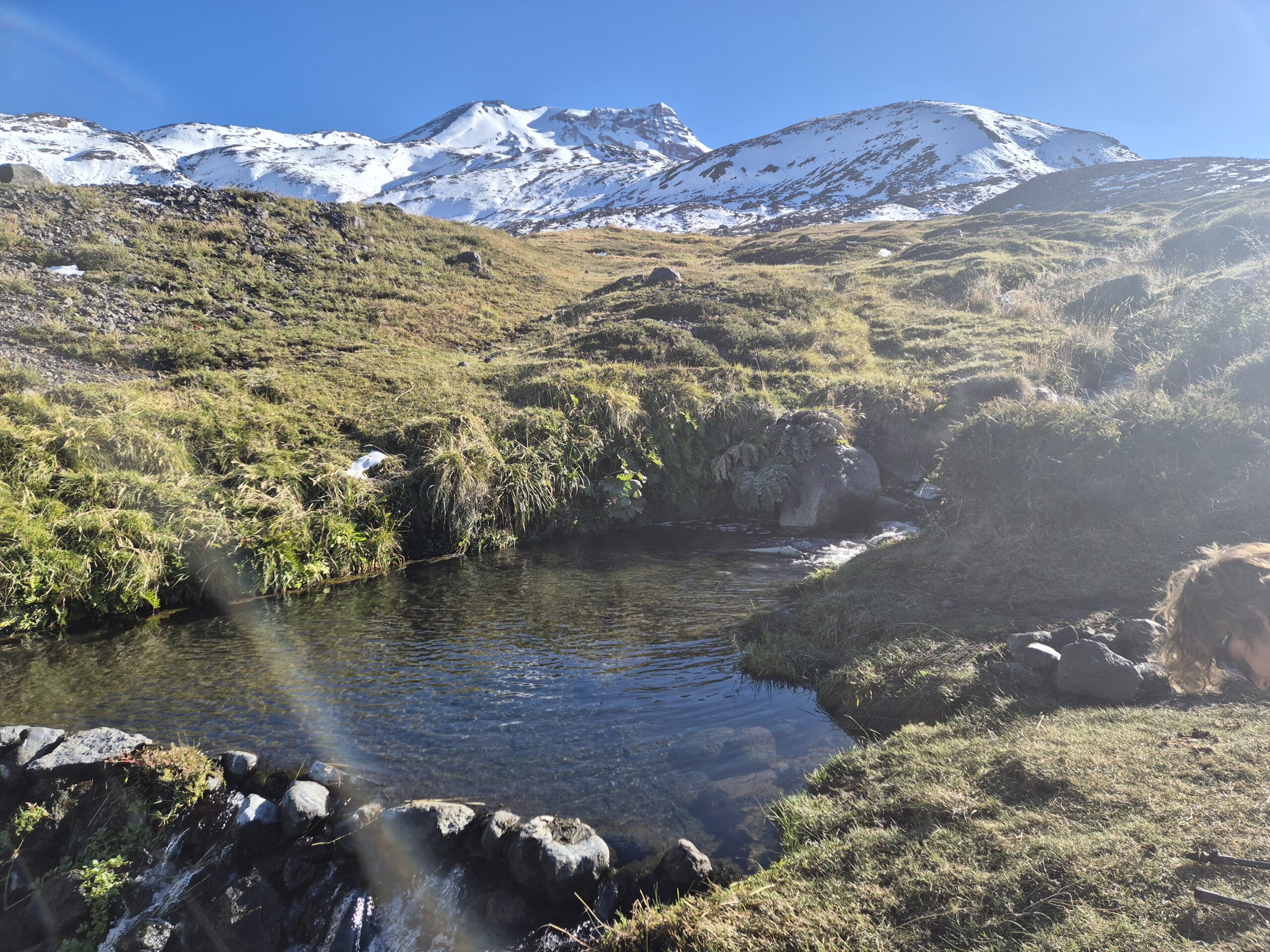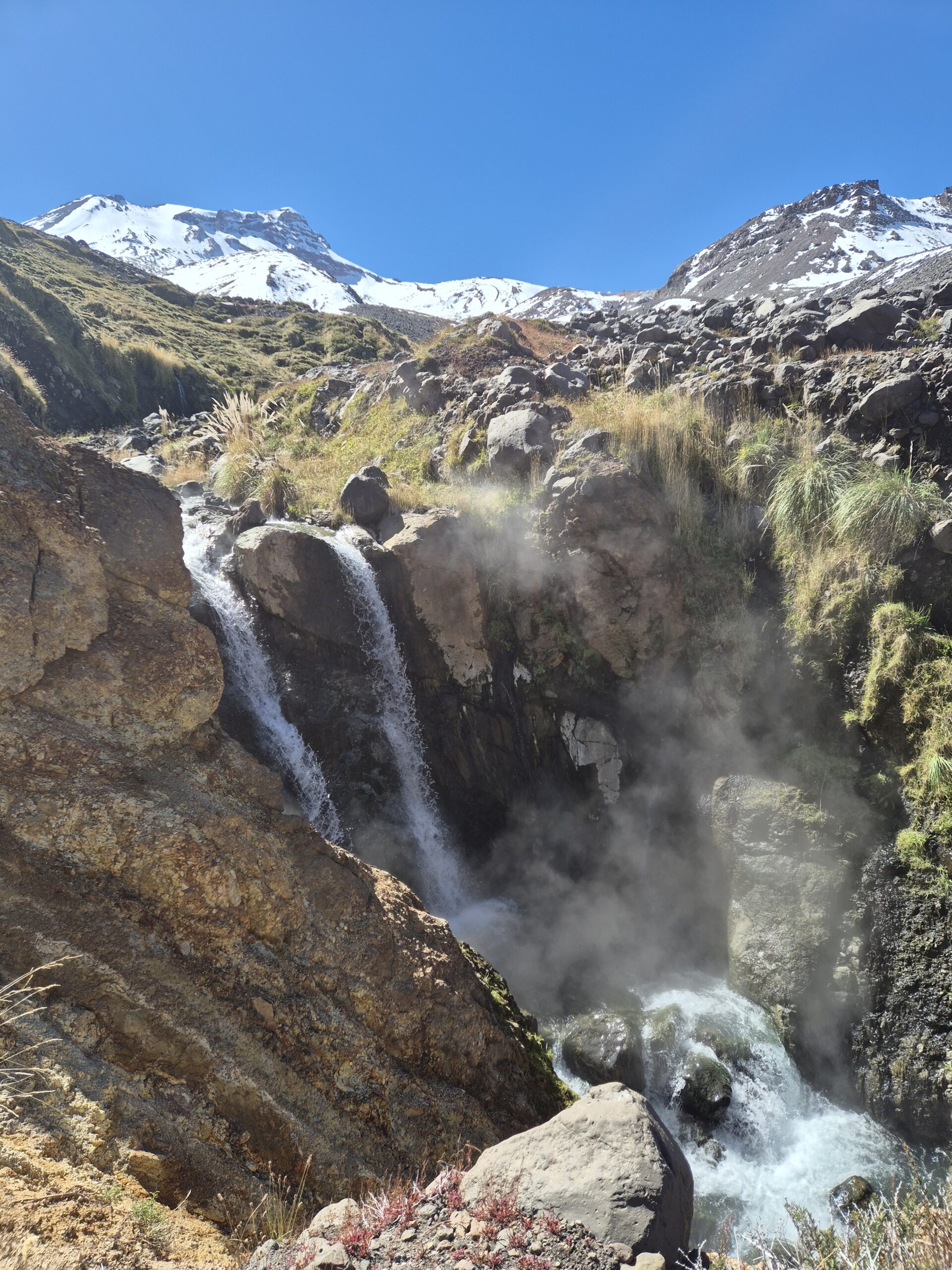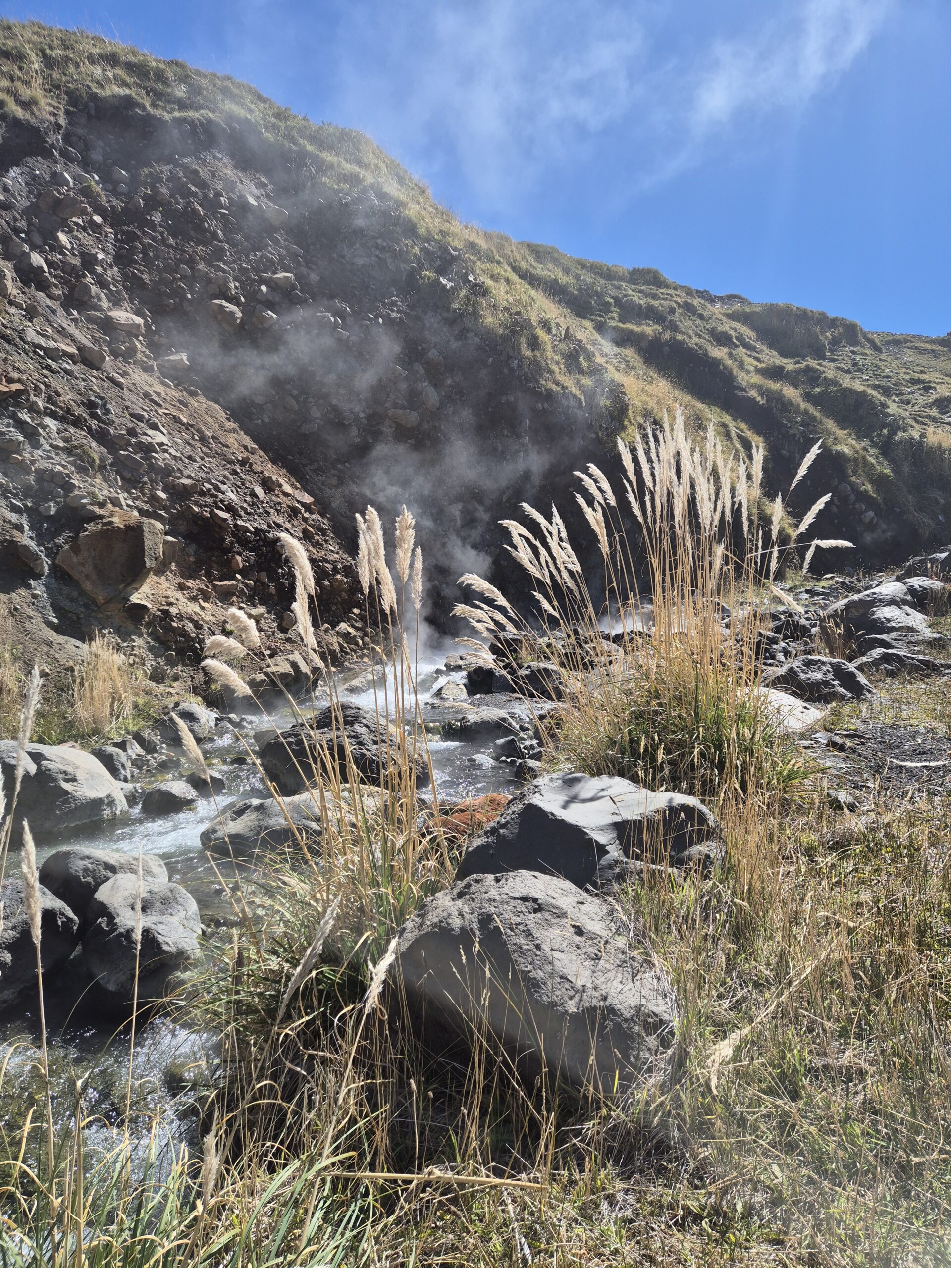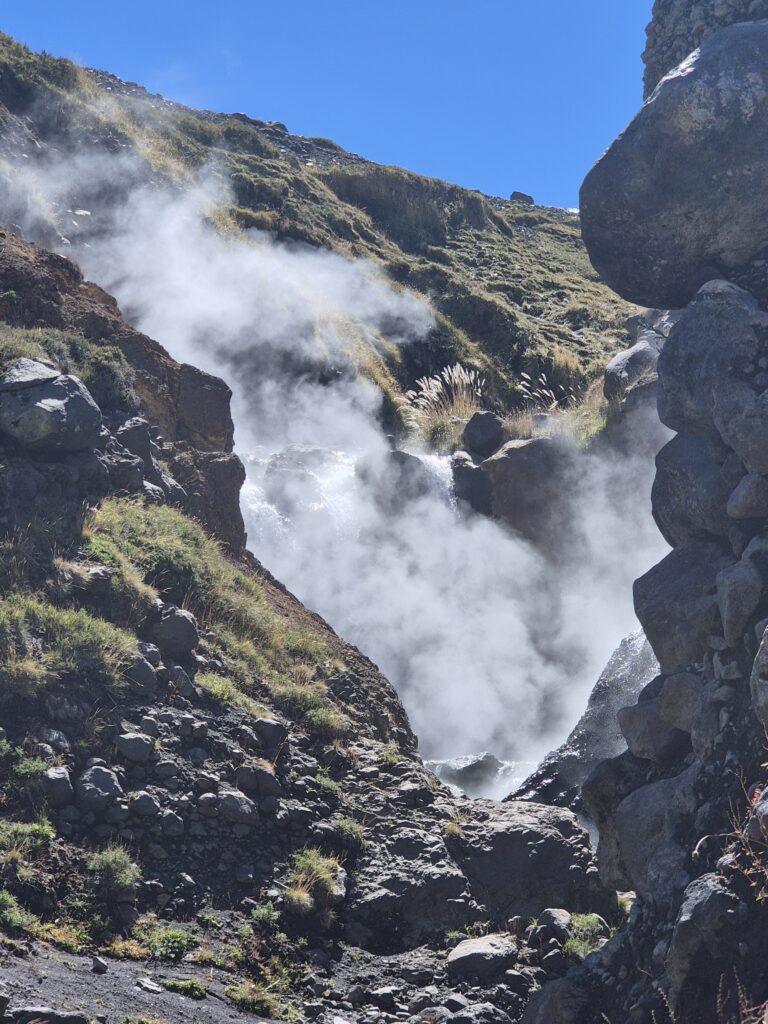 Nett aber draußen ist es noch so frisch, dass wir uns einmal ins warme Wasser getaucht nicht mehr hinauswagen. Die Badeerfahrung wird nochmal schöner, als wir ein kleines Sprudelbecken finden. Nach 2 h ausgiebigem Faulenzen im warmen Wasser wollen wir das Tal weiter erkunden. Allerdings kommen wir nicht weit. Hinter der nächsten Geröllrippe eines ehemaligen Vulkanausbruchs stürzt sich ein 46 Grad heißer Fluss in die Tiefe und vereint sich mit einem weiteren 28 Grad kühlen Fluss.