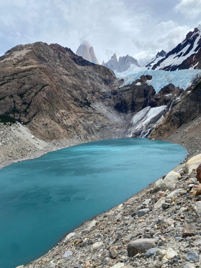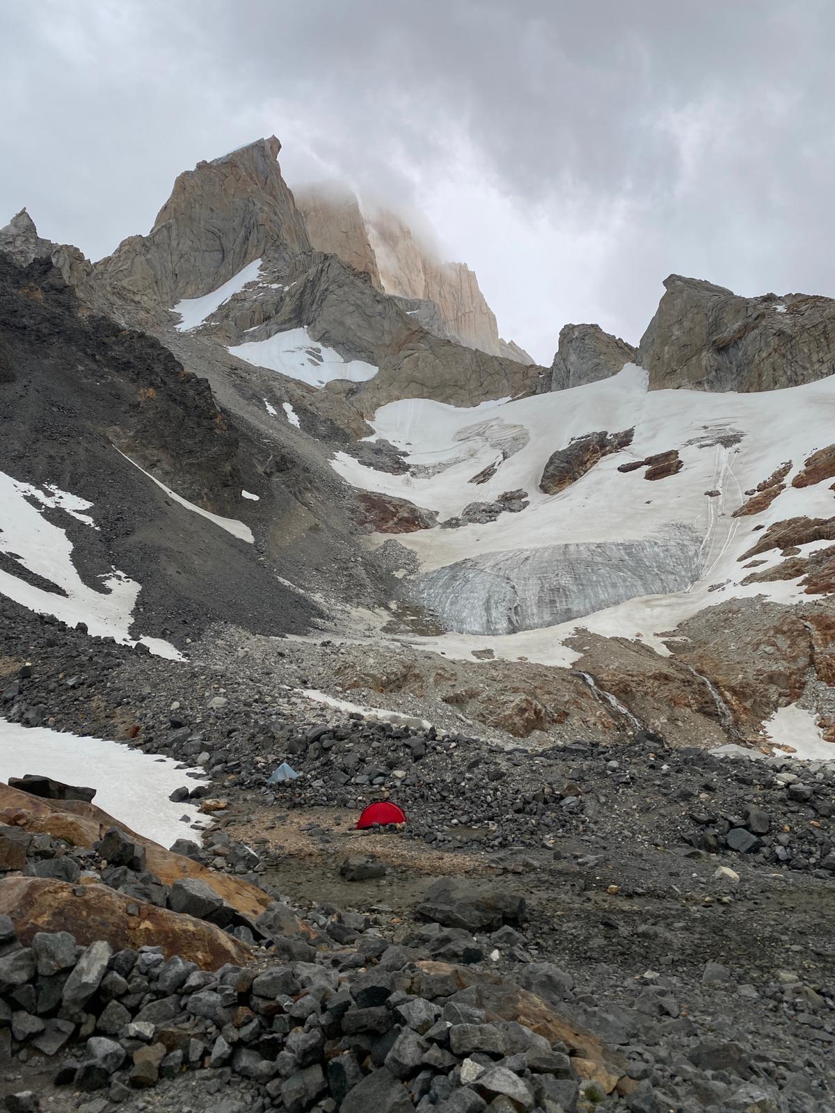 Eine ganze Weile folge ich dem Tal, bis ich linker Hand steil aufwärts in Richtung meines Gipfelziels abzweige. Gänzlich ohne Serpentinen geht es geradewegs empor. Auch wenn mir von entgegenkommenden Wanderern das Kompliment gemacht wird, dass ich sehr dynamisch aufwärts stiege, fühle ich mich doch alles andere als das, will nur noch ankommen, eine Etappe von 12 km und 1200 Höhenmetern reicht nach dieser Anreise doch allemal. Um halb acht Uhr abends schlage ich mein Lager an den Geröllfeldern unterhalb einer Gletscherzunge auf. Für einen Augenblick reißen die Wolken über mir soweit auf, dass man nicht nur die Aguja Guillaumet erkennen kann, die ich in den folgenden Tagen erklettern will, sondern auch den Fitzroy unglaublich hoch darüber. Im einsetzenden Nieselregen baue ich das Zelt auf und kann mich als sehr glücklich schätzen, dass es in der Nacht nicht allzu stark windet.