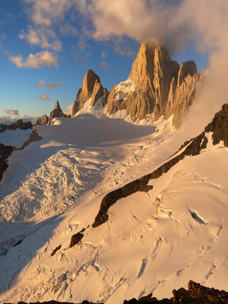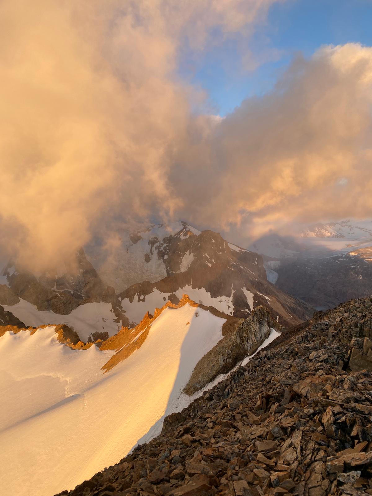 Der Morgen erwartet mich mit ziemlich frischen Temperaturen, von vielleicht -3 Grad, die mich zu einem Aufbruch noch vor 4:00 Uhr bewegen. Über Blockfelder der unangenehmeren Art stapfe ich Hang aufwärts im kleinen, kaum mehr als 2 m weit reichenden Lichtkegel der Stirnlampe. Als ich weit genug von allen Routen entfernt bin, wo im Laufe des Tages Menschen vorbeikommen könnten, deponiere ich meinen Rucksack und steige folglich unbeschwerter aufwärts. Einem kleinen Rücken folge ich in Richtung Grat, muss aber zweimal Steilstufen in leichter Kletterei umgehen. Darüber erreiche ich eine weitläufige geröllige Flanke, nicht minder instabil und unangenehm als erwartet. Ihr entstiegen stehe ich plötzlich der aufgehenden Sonne gegenüber, weiter erstreckt sich unter mir die Pampa, rechts glitzert silbrig der Lago Viedma. Zu meinen Füßen entspringt ein wild zerklüfteter Gletscher, zu seiner rechten streben die Spitzen des Fitzroy Massivs himmelwärts. Wie viel zu schmal geratene hohe Felstürme, jeglicher Schwerkraft widersprechend, wirken diese Riesen, die mit Wänden von 1000 m aufwarten. Ohne diese Berge gesehen zu haben, kann man sich nicht vorstellen, dass sie existieren. Dann treffen die ersten Sonnenstrahlen auf die höchsten Spitzen, sie beginnen, feuerrot zu leuchten, nur verhüllt von einigen Wolkenfetzen, zurecht trägt der Cerro Chalten den Namen rauchender Berg. Auch die Kämme dahinter entblättern sich mehr und mehr aus ihrem Wolkenkleid. Aus den Wolkenbänken über dem Inlandeis gehen Regenschauer nieder, gestreift von den schräg stehenden Sonnenstrahlen leuchten sie in surrealem Orange. Mehrmals muss ich das Bild auf meiner Kamera mit der Wirklichkeit abgleichen, frage mich zwischenzeitlich schon, ob meine Kamera einen farblichen Defekt haben könnte.